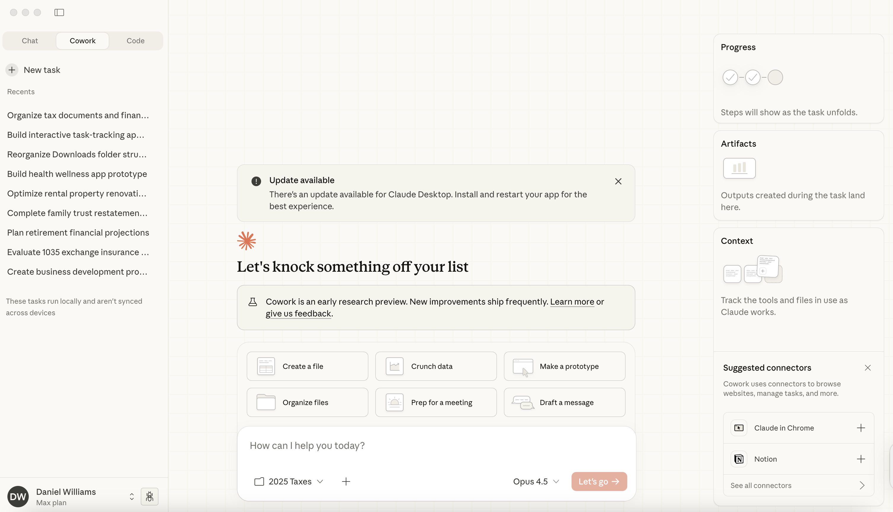 Tax filing prep: Cowork launched just in time to help me gather all my tax documents and organize them for my CPA. Usually, this process is annoying, but it has to be done every year. With Cowork, it was actually fun to see it analyze financial statements and bank records, and organize everything into a neat package for the CPA.