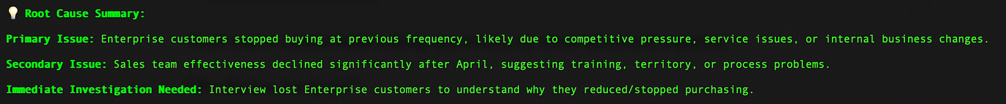 Why did Q2 sales drop?Claude will likely respond with a detailed analysis along with a root cause summary: