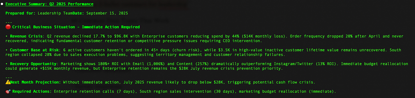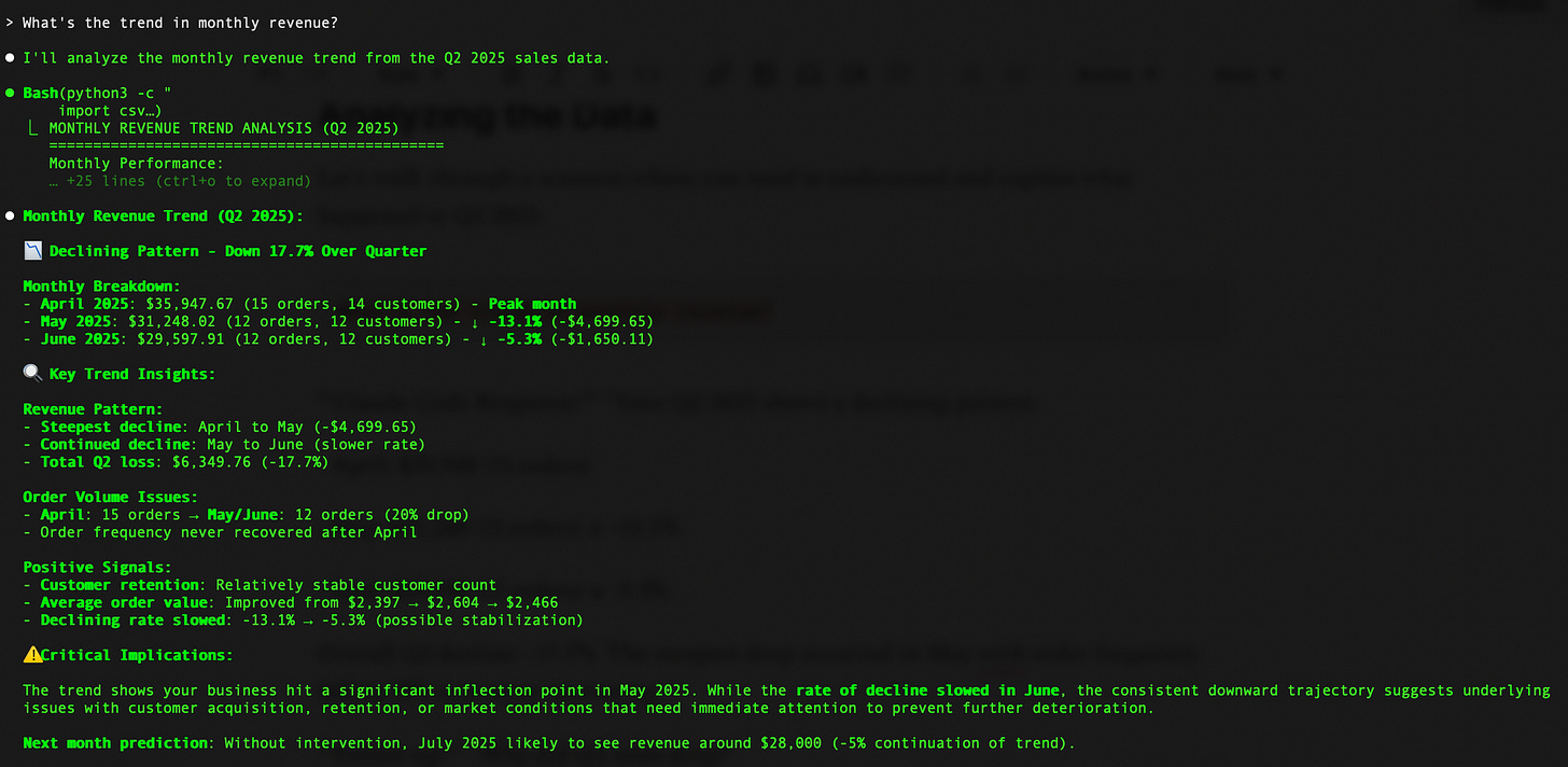 Why did Q2 sales drop?Which region is growing fastest?Show me customers who haven't ordered in 6 months.Create a summary for the executive team.What should we focus on next quarter?Pro Tip: Claude Code works best with well-structured data files that include: